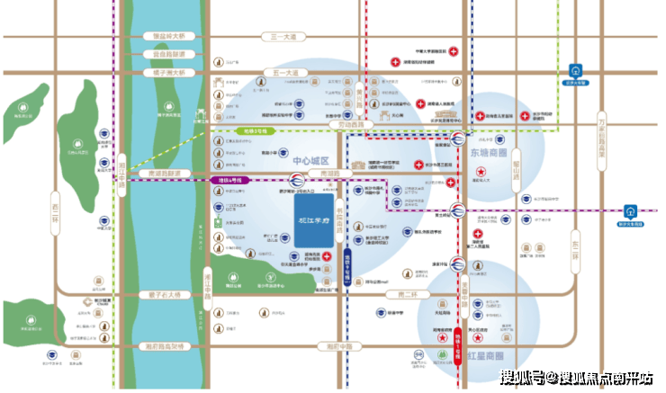①三横三纵立体交通网络:劳动西路、南湖路、南二环拉通东西;芙蓉中路、书院路、湘江中路贯穿南北;