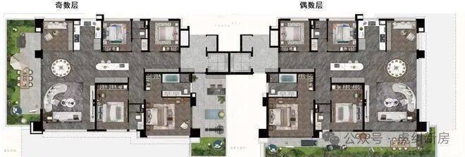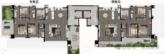 至于奇偶层的设计,与上面的户型完全一致,一个是南向长条的庭院,一个是分割的。