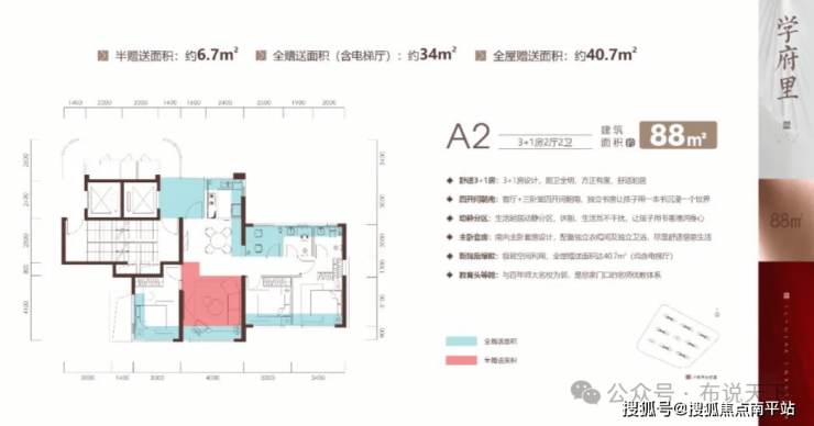 建面约88㎡户型是堪称‘空间魔术师’的明星户型!得房率达到惊人的116%,全赠送面积达40.7㎡,实际得面积约102平米。