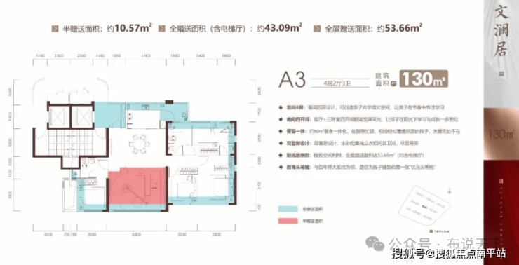 建面约130㎡户型是当之无愧的压轴级作品,得房率达到117%,全屋赠送面积达53.66㎡!也是整个市场的户型天花板!约130㎡户型,大尺度奢阔四房设计,四开间朝南,双套房配置,拥6米宽幕客厅,享受媲美豪宅的空间体验,定义终极改善生活。