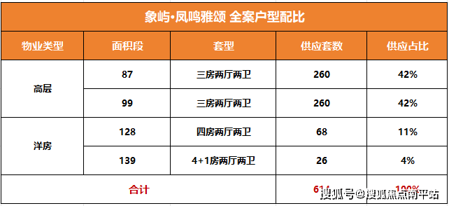 项目三栋洋房规划为128平四房两厅两卫、139平4+1房两厅两卫四代宅产品,二者合计约94套,占比约15%。