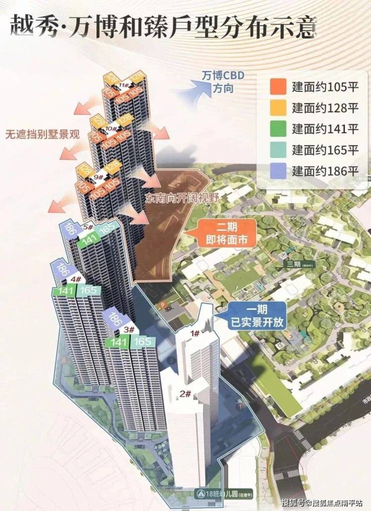 在CBD组团内,二期在位置上更靠近万博CBD,在景观上享受南向观园,跟最优朝向相一致。主推建面约105平及建面约128平四房。