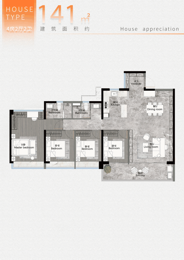 全新迭代超新规128㎡户型,四房两厅两卫 ;