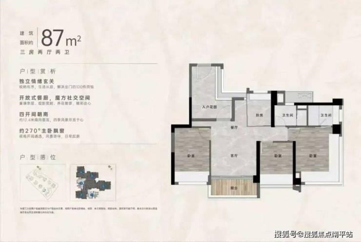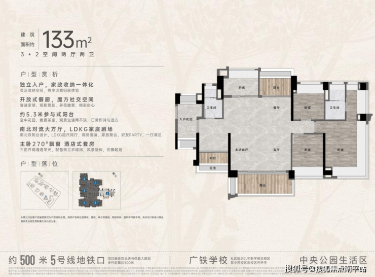 “中央公园”,紧邻大脚印公园,距离地铁约500米,紧邻学校、酒店,户型涵盖75-88㎡三房,105、125、142㎡四房。