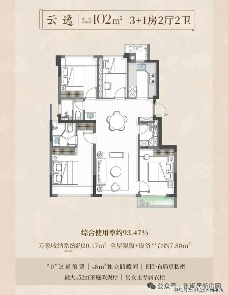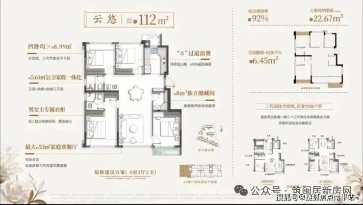 超高得房率是其最大亮点:89㎡得约91%,102㎡得约93.5%,112㎡得约92%。