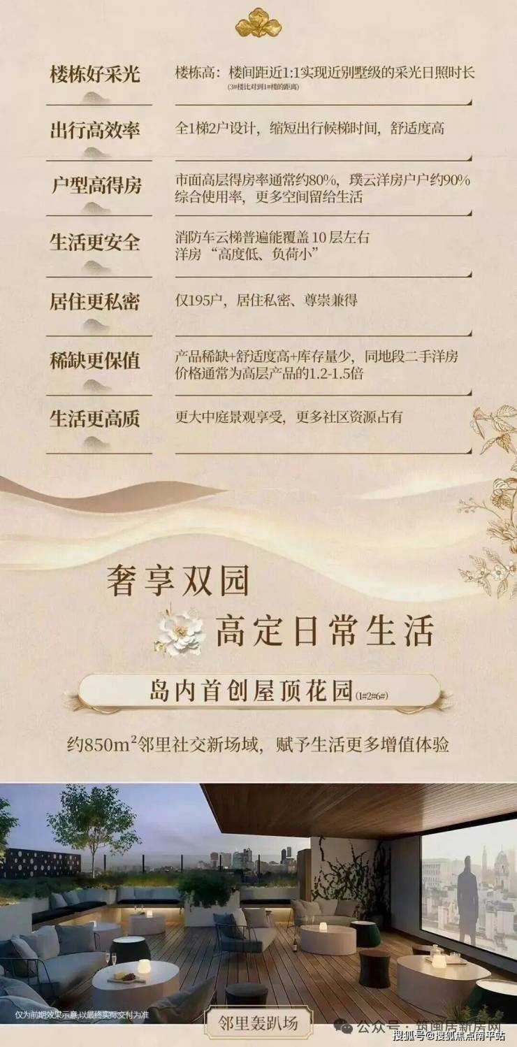 岛内首创的屋顶花园(1、2、6#楼栋配备)和万象收纳系统也是重要卖点。