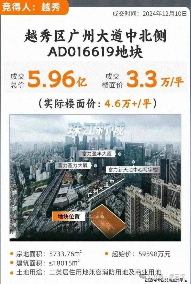 2024年12月越秀地产以59598万总价拿下越秀区广州大道中地块,扣除配建后,楼面价约4.6万/平。
