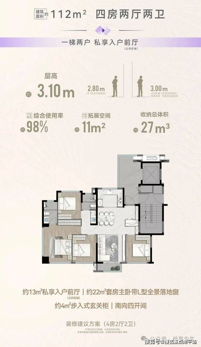 112㎡更是夸张,近乎100%得房率+3.1米奢阔层高,光入户玄关就有十几平,主推户型主卧标配L型全落地窗,视野和采光直接拉满。