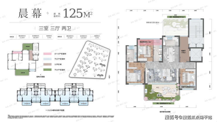 全域:占地面积约4.3万㎡ 综合容积率约1.4 总建筑面积约11.7万㎡ 共648户