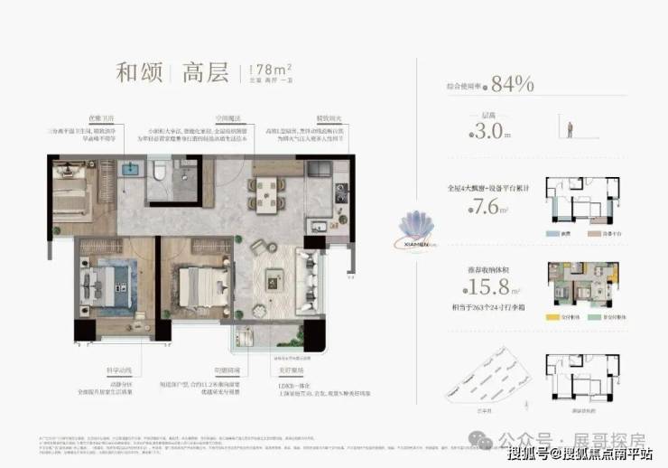 •78㎡刚需首选:通过飘窗、阳台赠送,实际使用能到 84%,还做了三卧室朝南,书房后期能改成婴儿房,对小家庭太友好;