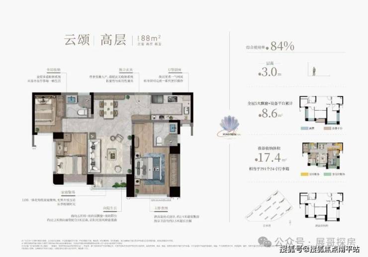 •89㎡明星户型:LDK 一体化设计让餐客厨形成 28㎡的核心区,双卫 + 独立家政间的配置,在同面积段里几乎找不到对手;