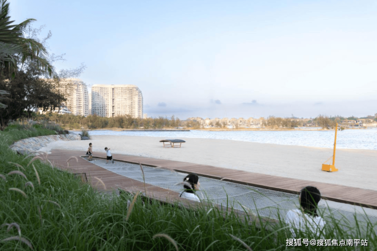 约1.6 公里滨海动线串联六大生活聚场,却不扰自然本真韵律。 这里是自然的留白之地,也是心灵的疗愈之所。飞茑千屿的狼尾草随风轻摇,椰林步道绿荫遮蔽骄阳,海风营地藏着慢时光,流光泳池倒映星空与“蓝眼泪”。