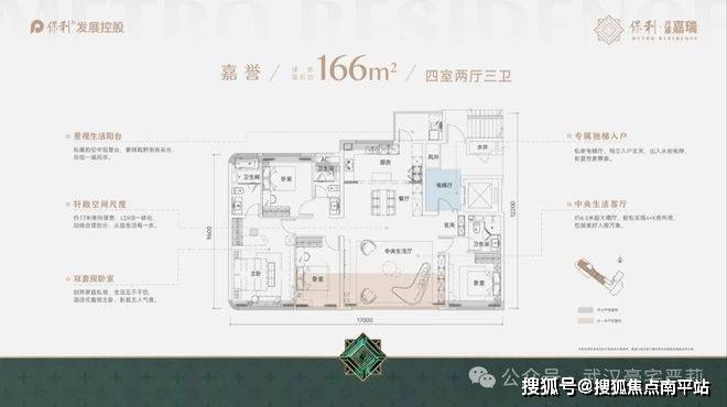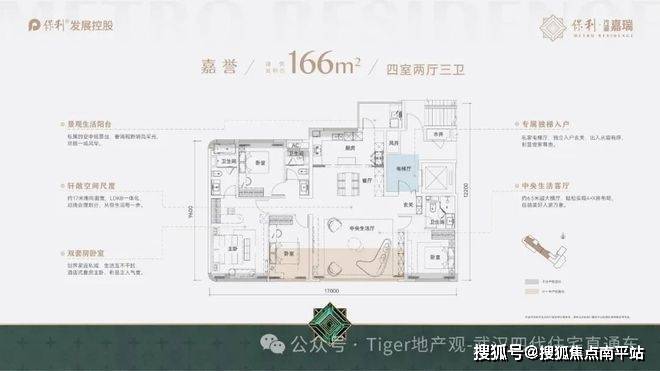 比如166户型,南向开间有17米,高层166平户型能做到这个尺度真的是相当惊人,要知道,二七滨江某盘169平的小高层都只做到了15米的开间,武昌滨江某豪宅188平的高层只做到了13.95米的南向开间。
