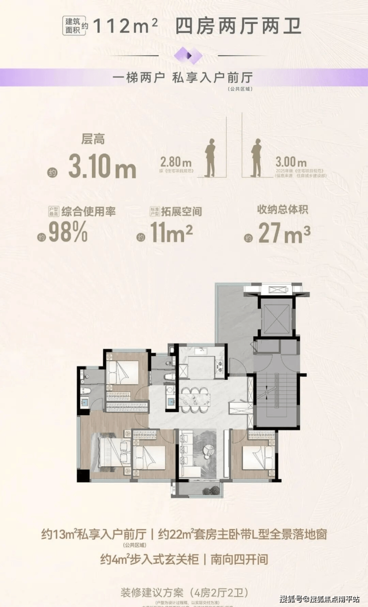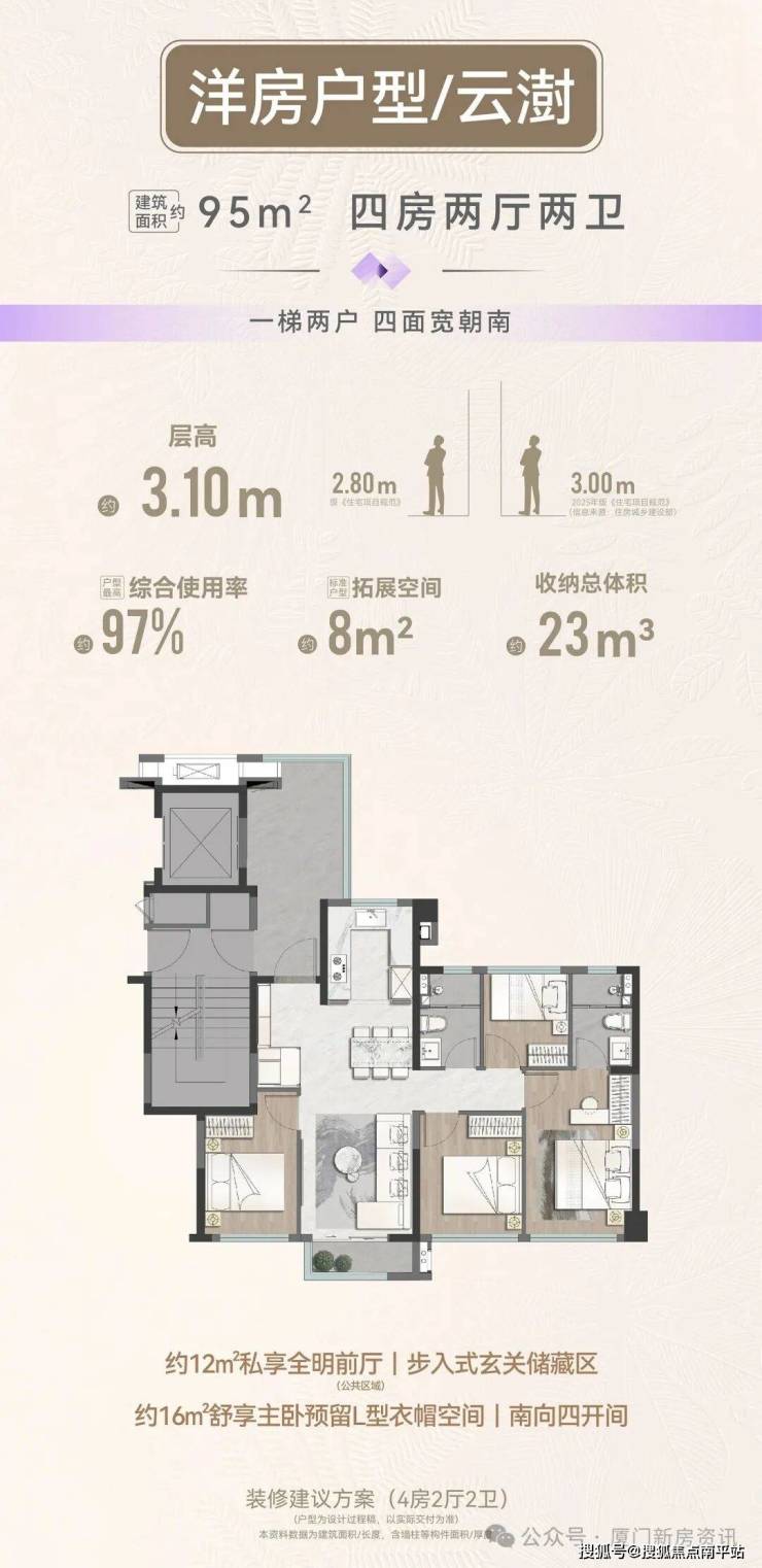 建面112m²洋房为岛内新品,独门独户,私享约12㎡超大电梯厅,作为思明东少见的低密洋房。3.1米层高,大露台,近100%的综合使用率。
