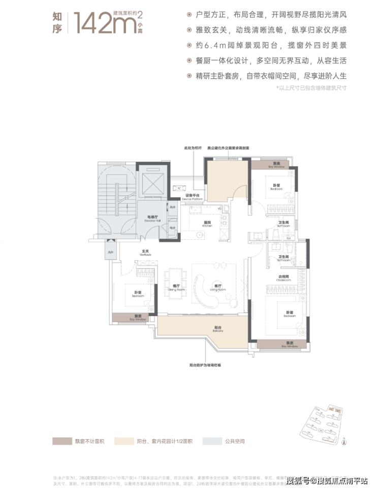 建面约142㎡户型,以开阔的空间格局和精益求精的细节考量,满足每一位居者对美好生活的向往;约6.4m阔绰景观阳台,清风阳光流连忘返,拥揽春华秋实四季人生景致;主卧套房,自带独立卫浴与衣帽间空间,让居者生活的仪式感不彰自显,从此尽享进阶人生。(以上尺寸已包含墙体建筑尺寸)