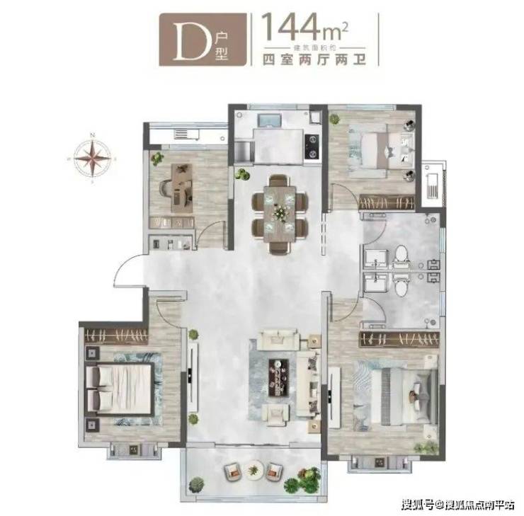 四室设计满足家庭不同需求,可设置独立书房、客房等。主卧套房设计,带独立卫生间,保障主人私密性。