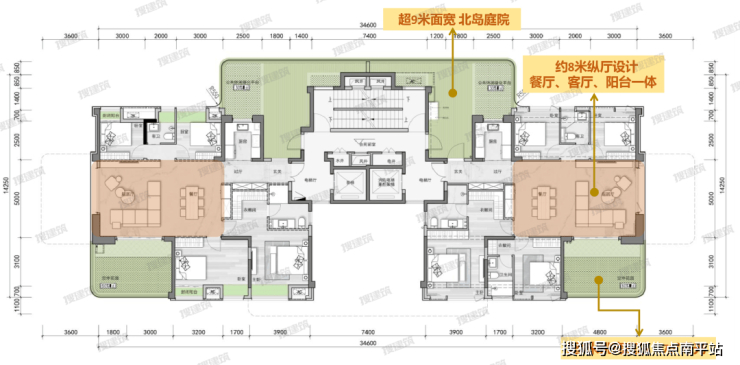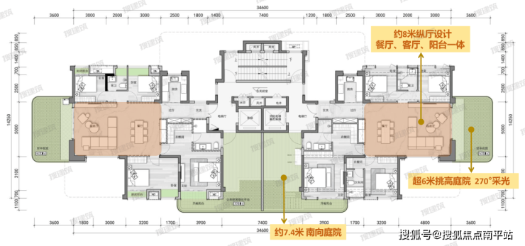 户型最大的亮点就是 南北双庭院 的设计: 南北庭院合计超过98㎡,北向庭院 约18.8米面宽 ,尤其在庭院 进深 全面升级,北向庭院进深突破到了 约5.65米 ;南向庭院 进深约3.6米 。