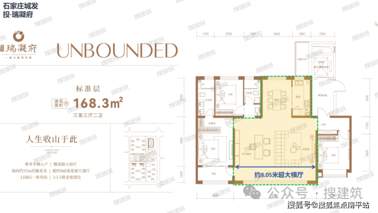 比如其建面约168㎡户型,功能齐全,动静分区明确,3房2厅2卫设计,1:1.5的黄金宽深比;尊享专梯入户,赠送独立前厅;整体南向 约15米超大面宽 ,整个户型的公区做了LDKG一体化设计,通厅 面宽超约8.05米 ,南北通透,舒适度极高。