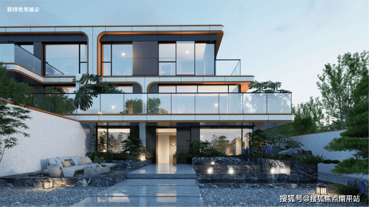 更值得称道的是,联排立面造型更显丰富立体:通过设计进退层次、搭配多元材质、结合露台花园的层层错落,塑造出“层层叠叠”的建筑形态,这种兼具韵律感与雕塑感的形态,不仅是视觉艺术,更成为居者身份的隐性标识。