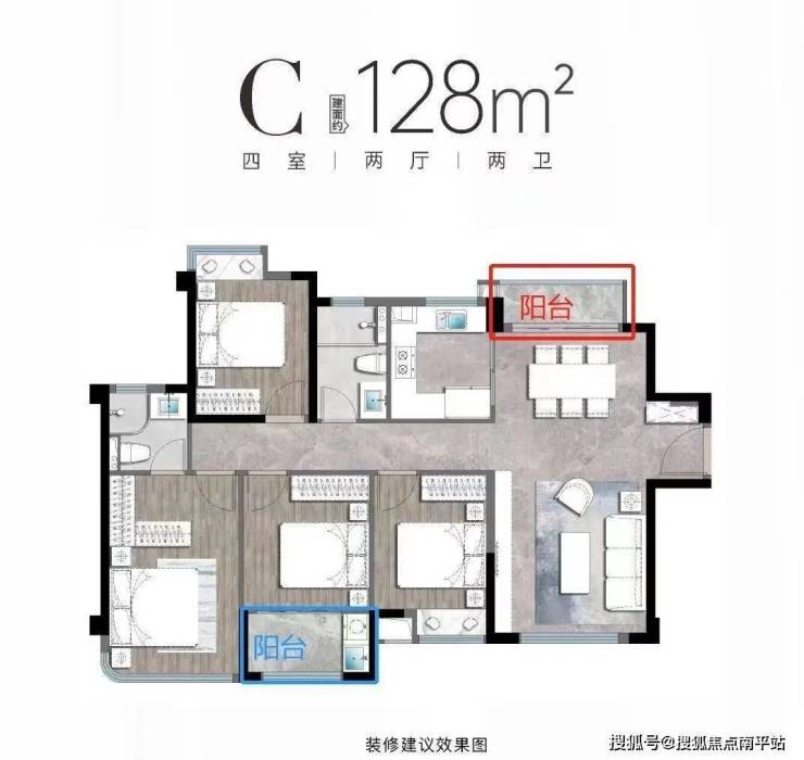 都是4房边套户型就拿来一起对比了,润璟128平4房客厅餐厅南北通透,两个阳台一个是在北面餐厅位置,一个是在南面次卧位置,晾晒衣服到次卧那边,北面的阳台可以用来观赏中庭园林;有两个飘窗赠送;润璟128平实际公摊率约21.4%,使用面积约100.61平,起步价不到800万元。这个户型是分布在3号楼、5号楼边套位置,项目南侧是厦门东部教堂和医疗用地,对风水介意的人慎买。
