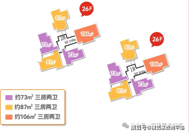 1、2栋户型分布一致,主打建面约73-87-106㎡三四房,总计250户 。