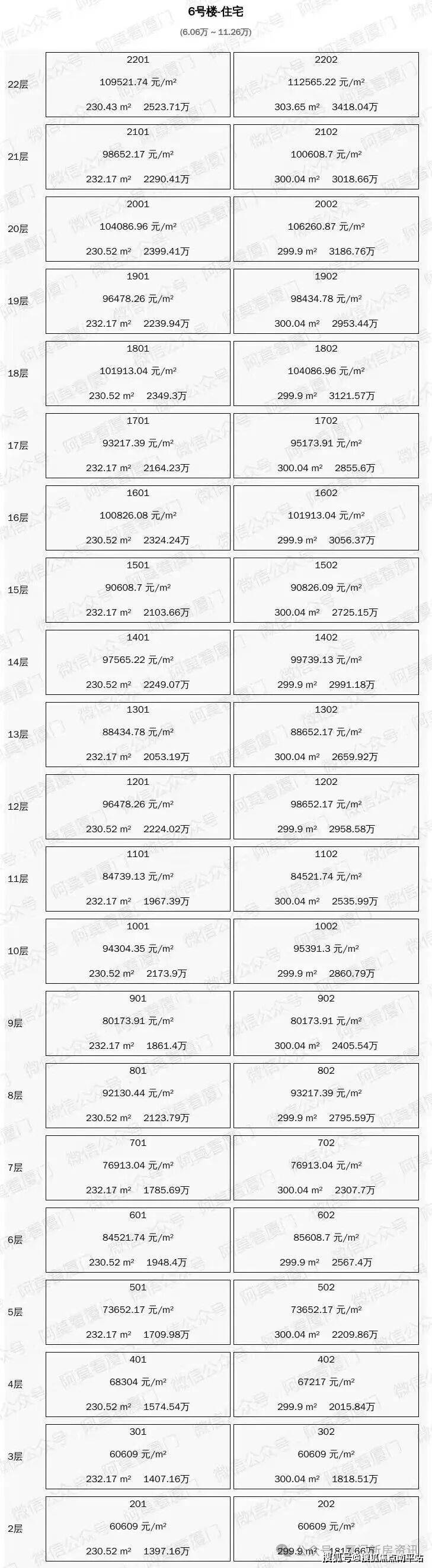 11月底9号楼取证首开,当天就去化80%,现在已基本卖光了。第二批次预售证刚拿,6、7、8号楼,户型188-200-230-300平的户型,单起价为58435元/平,最高单价112565元/平,房价表在文后。开盘1个月内爆卖20亿!