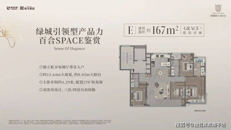 独立电梯厅专属入户,从踏入电梯厅的那一刻起,归家的仪式感便自然流露; 南向约15.64 米的超大面宽,让阳光能毫无保留地铺满室内,通透感与舒适度扑面而来; 主卧开间达 4.29 米,搭配 270° 转角窗,不仅空间更显开阔,窗外景致也能多角度融入室内,放大了居住的舒展感; 双套房设计则细致考量了家庭成员的居住需求,让每位居者都能拥有独立私密的生活场域,恰是改善生活里该有的尊崇与从容。