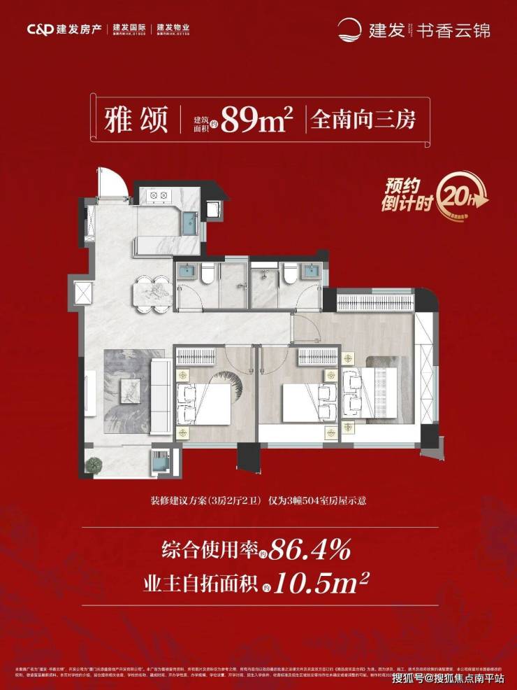 89㎡三房:全屋四开间约11.6米朝南,19㎡三面采光主卧,全明一字型卫生间。