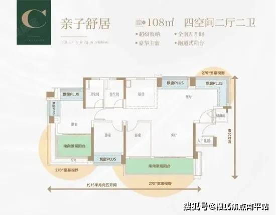 约11米全南向四开间,更大采光通风面,约5米长南向270°景观大阳台,豪华星级主卧套房设计,270°IMAX视野盛宴+三面通透采光,南望中央园景泳池,小户型的越级享受,畅享星级酒店的居住体验。