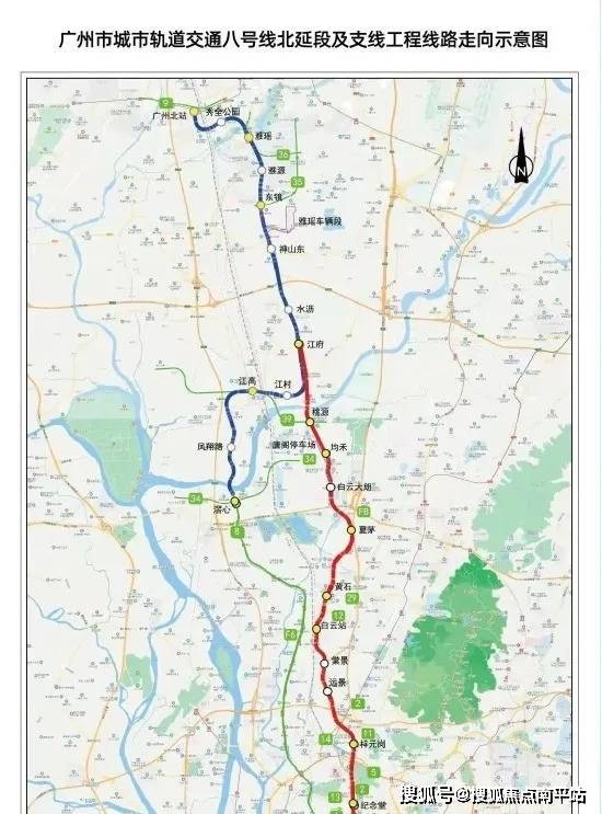 距地铁8号线北延段(在建)雅源站,直线距离约550米(数据来源:百度地图),2站到白云,3站到广州北站;