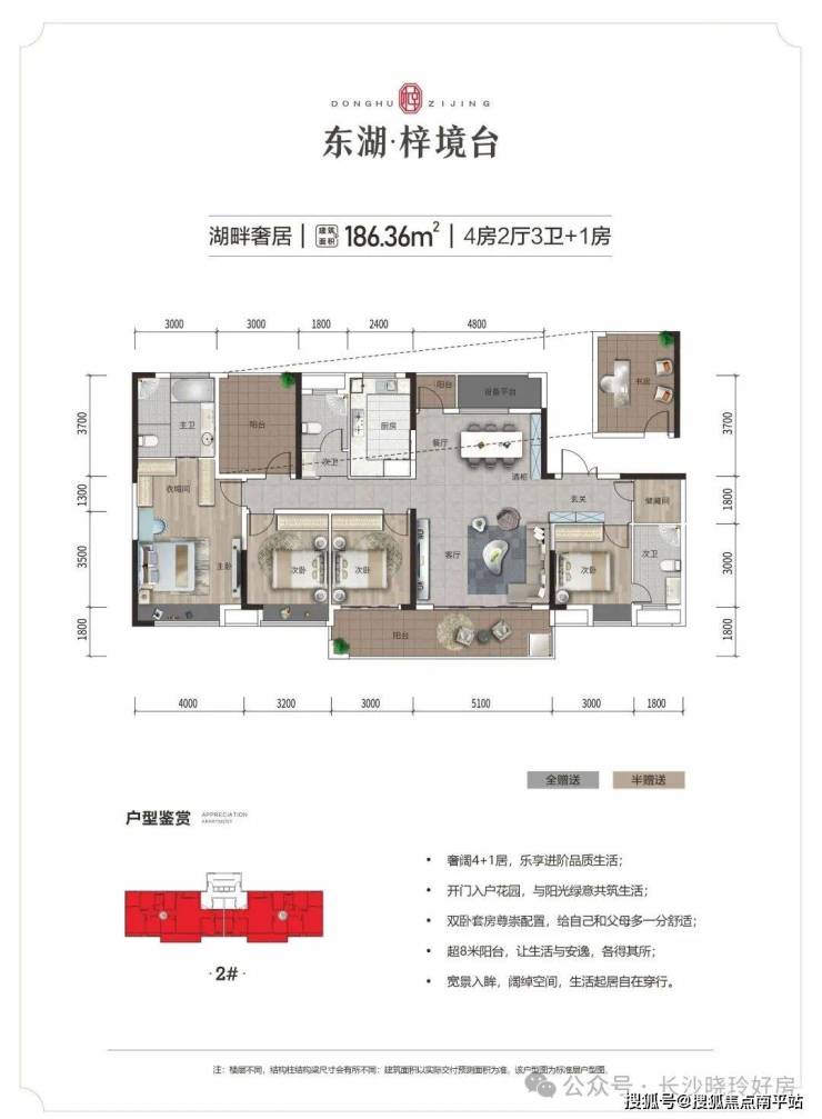 奢阔的186.36平方米户型为5房2厅3卫,双卧套房设计可满足多代同堂需求,超8米宽景阳台尽享安逸品质生活。