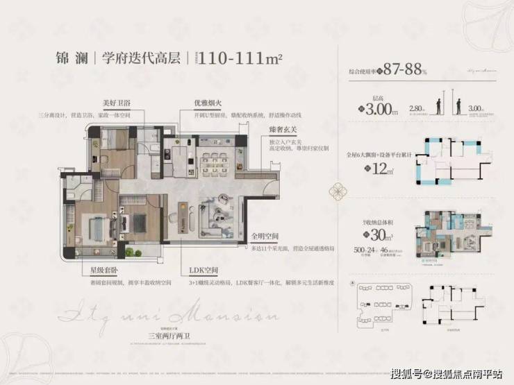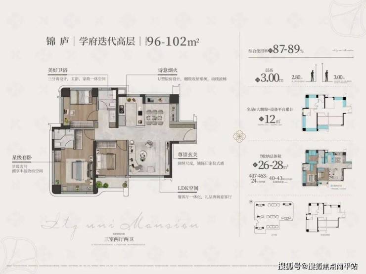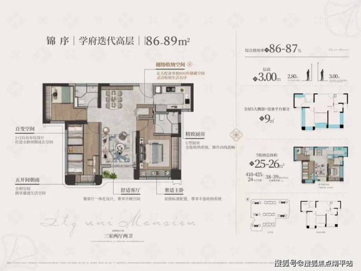 高层(精装三房/四房,3米层高,得房率86%-89%)