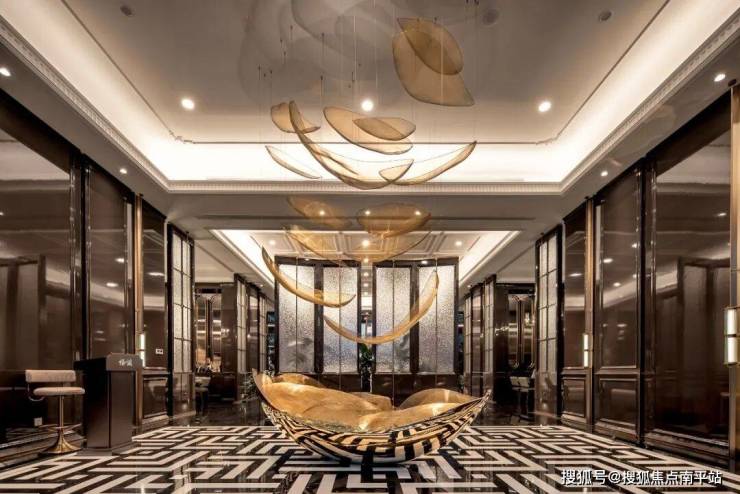 大堂内部,打造了一个现代古典新主义空间,黑白大理石拼花、高光混油木饰面、金属线条碰撞、船型装置聚焦视线,延续着奢华感。