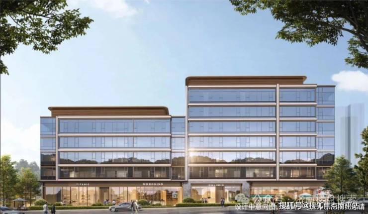 【外立面】:大面积玻璃幕墙+局部铝板线条