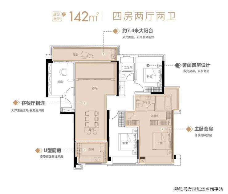 建面约142㎡四房,同样是奢阔四房设计。