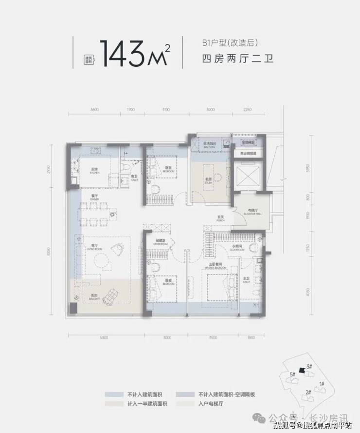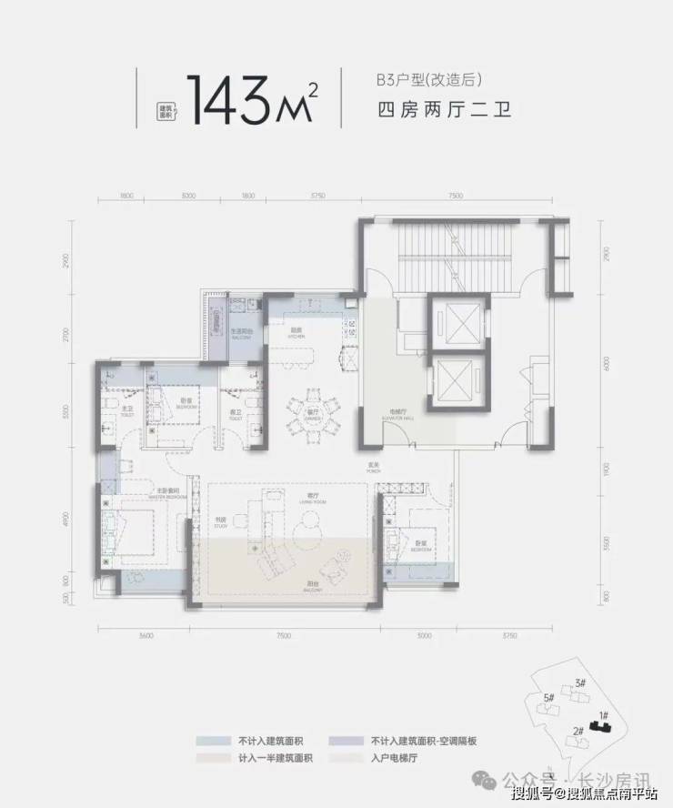 【梯户比】:2梯2户/2梯3户(1栋纯板楼,独立电梯厅约13㎡)(3栋边户143m²连廊122²)