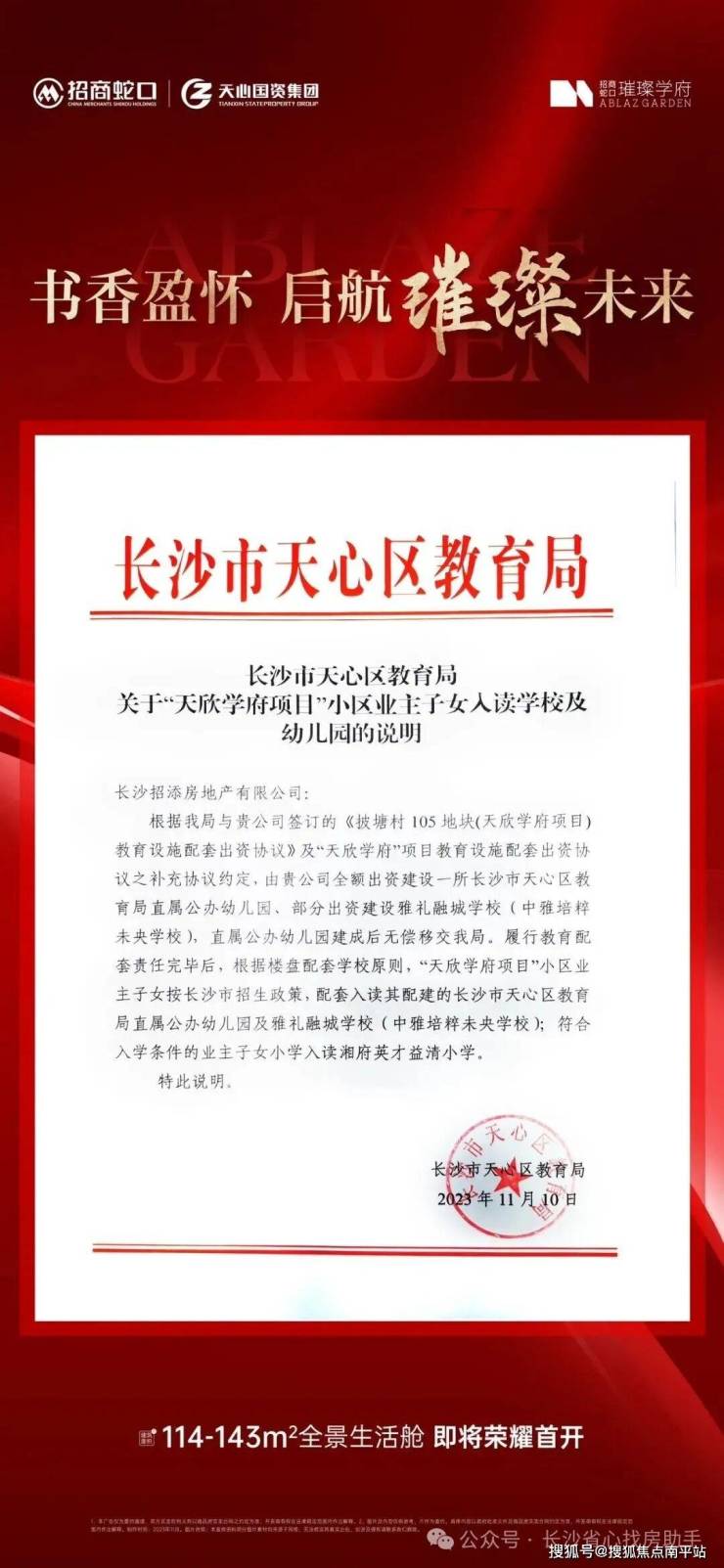 (注:教育配套信息来源于《长沙市天心区教育局关于“天欣学府项目”小区业主子女入读学校及幼儿园的说明》,仅供参考。学校的名称、建成时间、开办学性质、办学规模、学位设置、开学时间、招生条件、收费标准及招生区域划定等存在未确定或调整的可能,出卖人对此不做任何承诺,须以政府教育主管部门及校方的最新政策为准。)