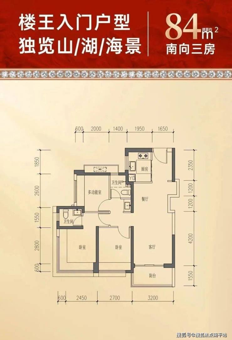 84㎡的3房2厅1卫 ,设计的是竖厅格局,客厅3.2米开间,LDKB一体化,S墙设计预留冰箱卡槽位,3个卧室分别做到了主卧10.37㎡/次卧9.18㎡/次卧7.54㎡(包含墙体飘窗),U型厨房,卫生间三段式分离, 得房率约77%(不含赠送),东南或者西南朝向。