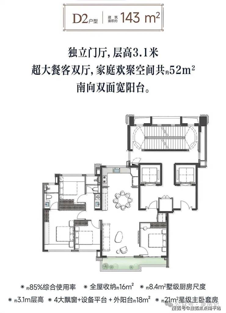 •总户数:982户,共规划13栋29层高层建筑,梯位为两梯两户或两梯三户布局;其中143㎡户型层高3.1米,还打造约2.8万㎡三重园林空间,楼间距规划宽松以保障采光;车位配比1:1.2,地下车位数1104个,能满足业主停车需求;