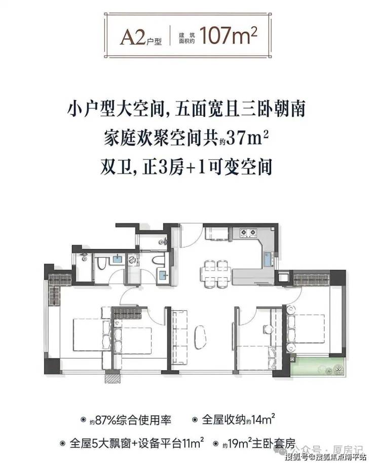 •104㎡户型有南向15米长真5面宽且卧室全朝南
