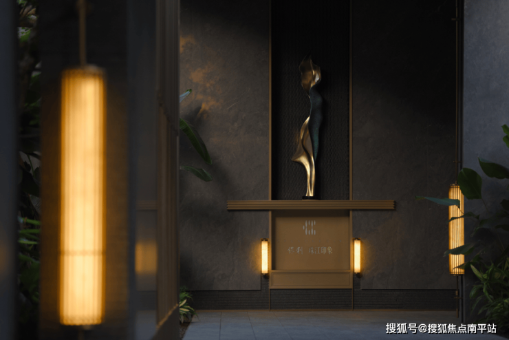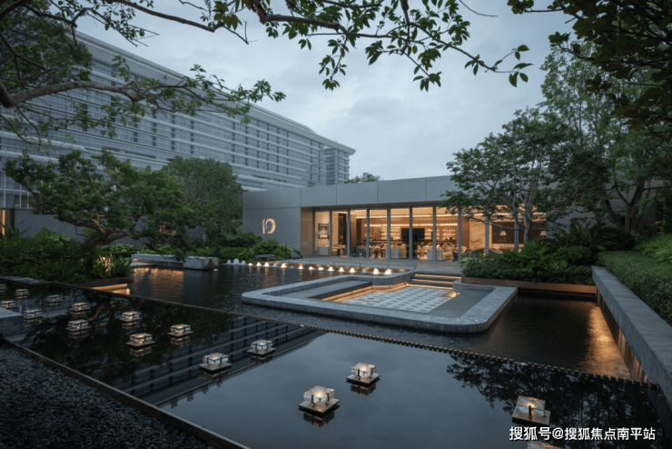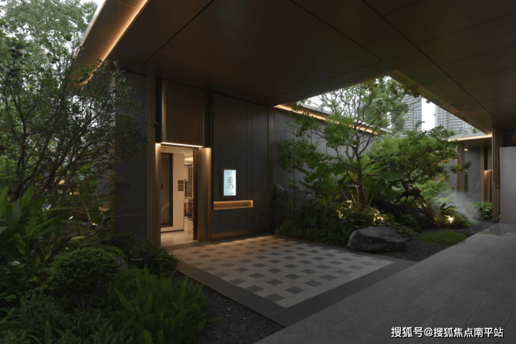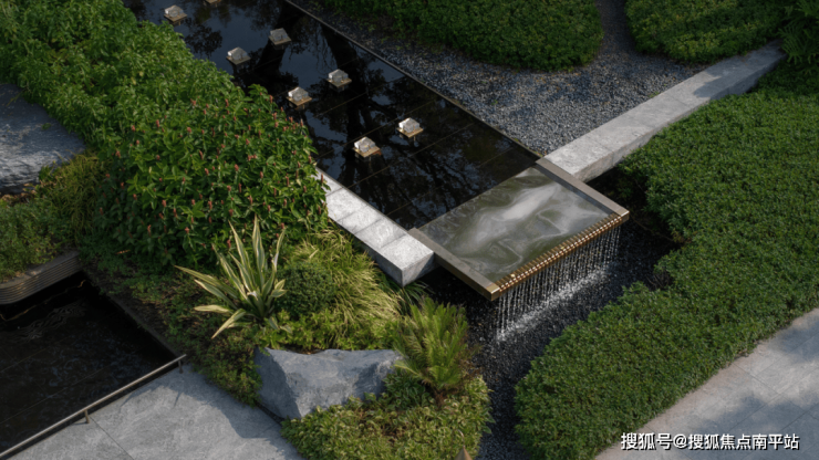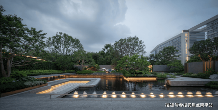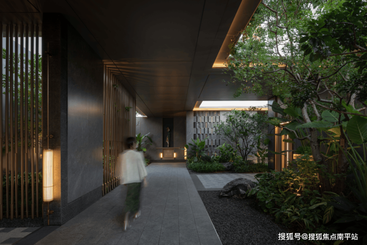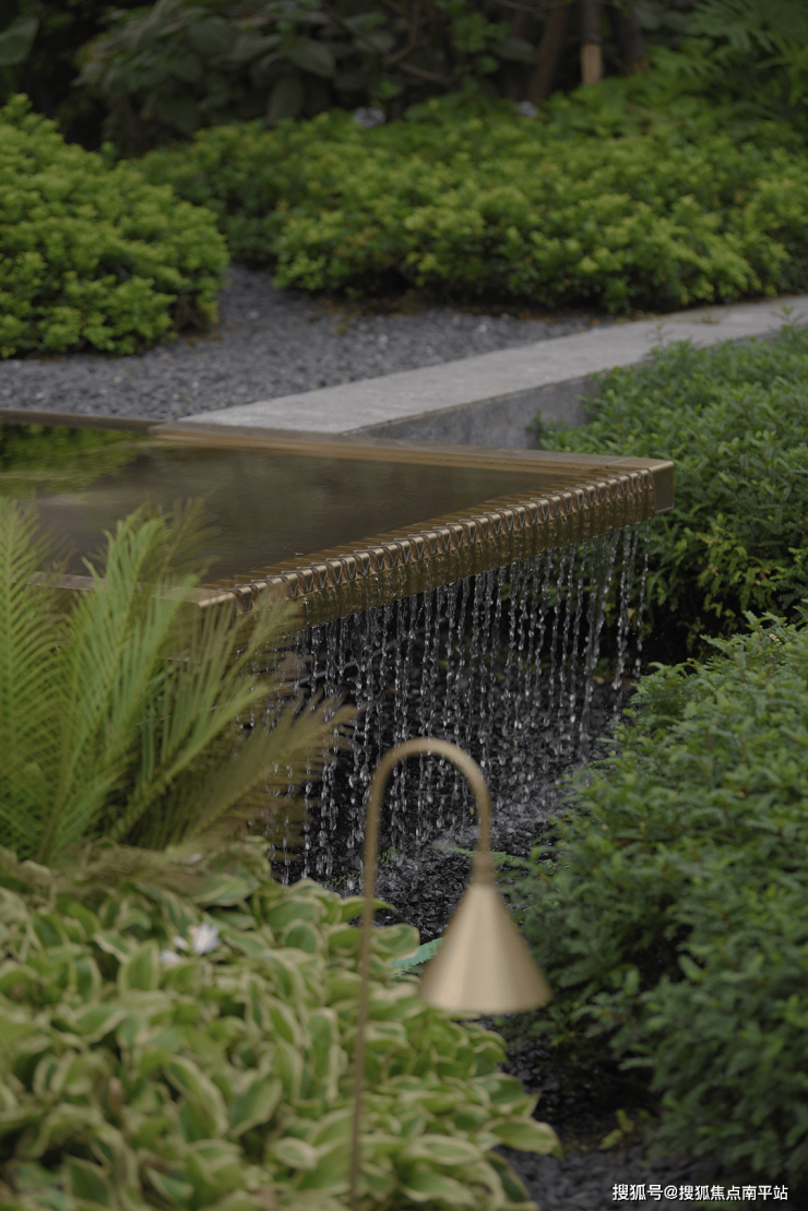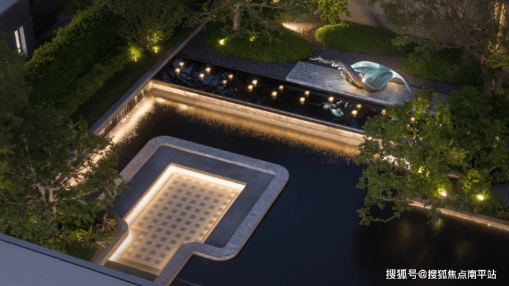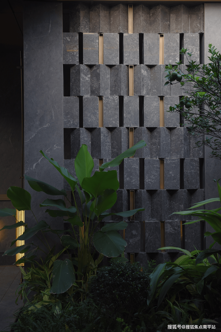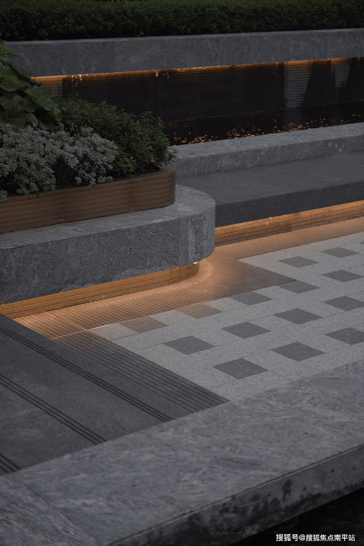 傍晚的灯光温柔洒落,既凸显了石材的沉稳质感,又让水流的动态更显鲜活,动静之间、虚实之中,整个空间散发着耐人寻味的魅力,引人驻足感受这份独特意境。
