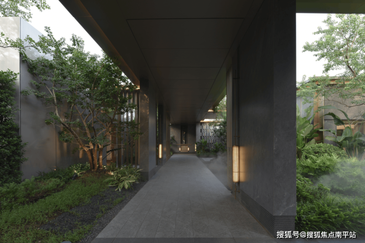 连廊四周错落布置多样植物林带,常绿植株与季相花卉交织,为空间注入自然生机与色彩。