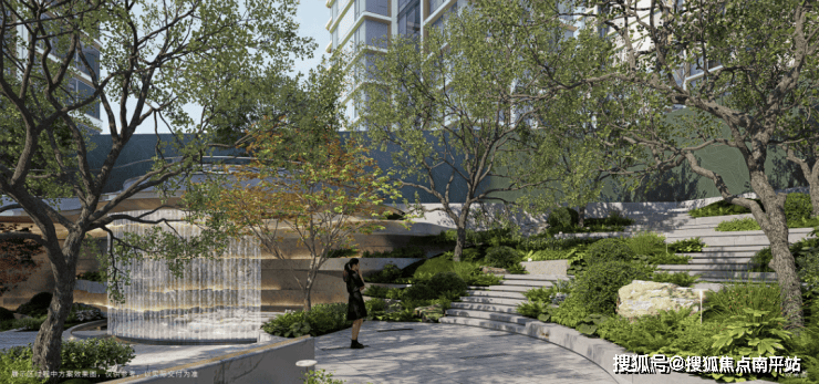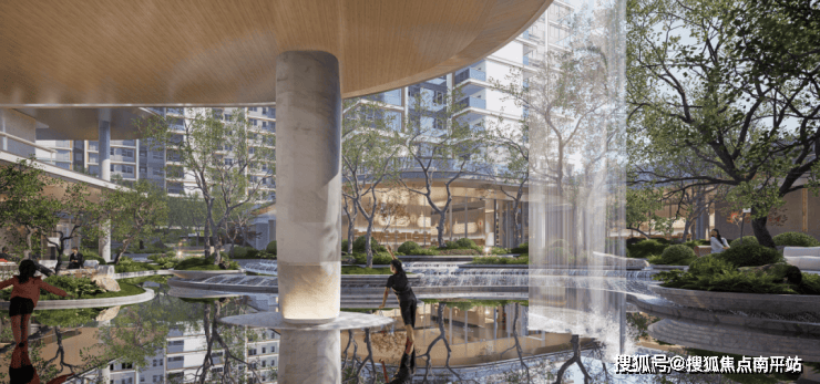 地上是景观空间、瀑布溪谷,充满了野趣、飘逸而青翠的植物,肆意舒展。在此闲坐、散心,耳边是水声潺潺,眼前是光影掩映,松弛感拉满。
