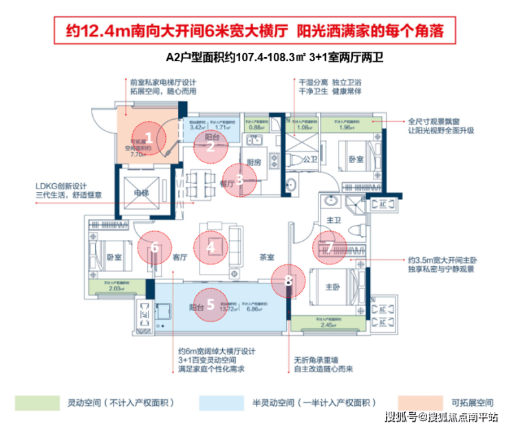⑥户型南向面宽约12.4米,且客厅可与南向卧室打通,空间更灵活;