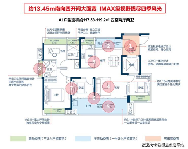 ⑥四开间朝南,南向面宽13.45米,室内更透亮;