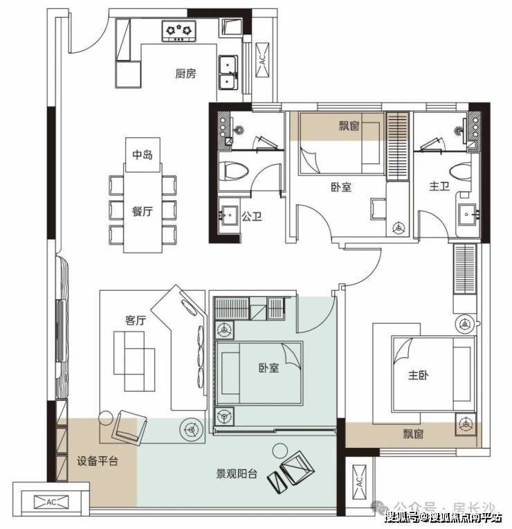 建面约108㎡三房两厅两卫: