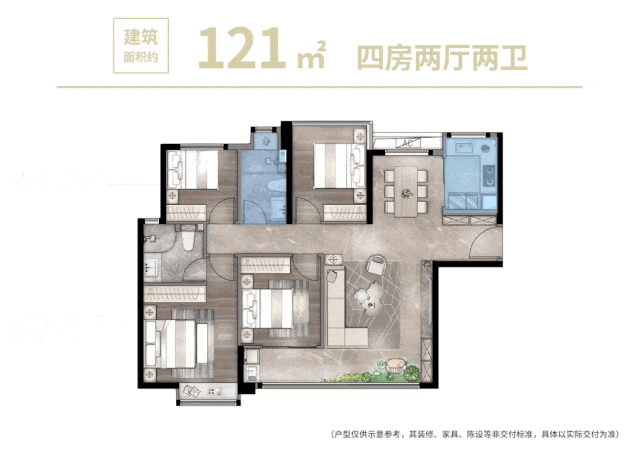 121㎡四房 6.8米可变横厅,少承重墙支持空间重组,灵活性高;