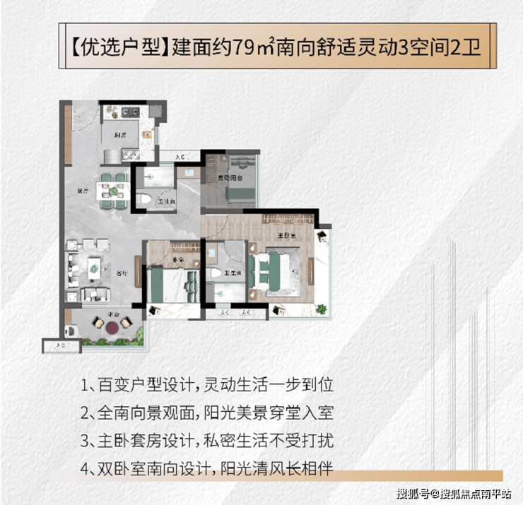 💫 建面约70-92㎡三至四房,高赠送,飘窗全部利用起来,保证舒适度和空间使用率。
