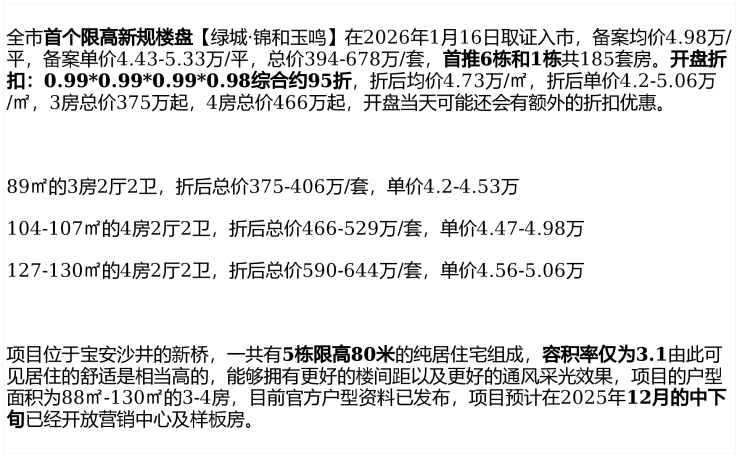 【绿城·锦和玉鸣】宝安新国标楼盘,价格已出,容积3.1低密小高层,3房375万起,4房446万起!