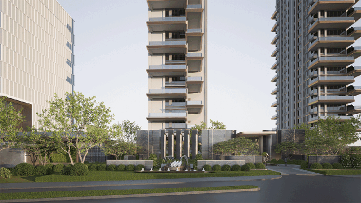 项目在近百亩的占地上,打造大体量规模公区。社区入户以 超长艺术化城市界面的打造重塑豪宅排面,融合世界大师高迪的曲线美学与闽南传统人文符号「燕尾脊」的 美学建筑立面,勾勒出城市天际线的高阶审美。